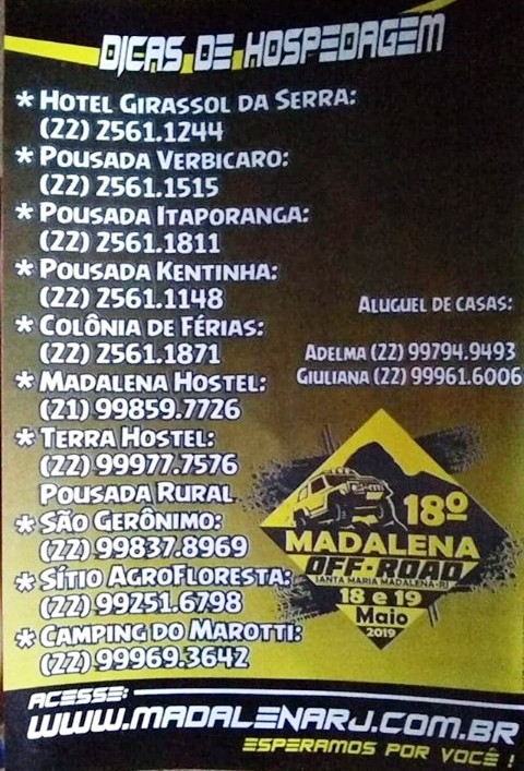 O folder acima trás opções de hospedagem na cidade e seus arredores. Quem ainda não se programou é melhor correr, pois restam poucas vagas.Mais informações podem ser obtidas nos seguintes números: (22) 99984-1767 - Edson / 99965-2823 - Rader / 99971-0093 - Celso / 99913-7798 - Wagner / 99871-7417 - Rafael.